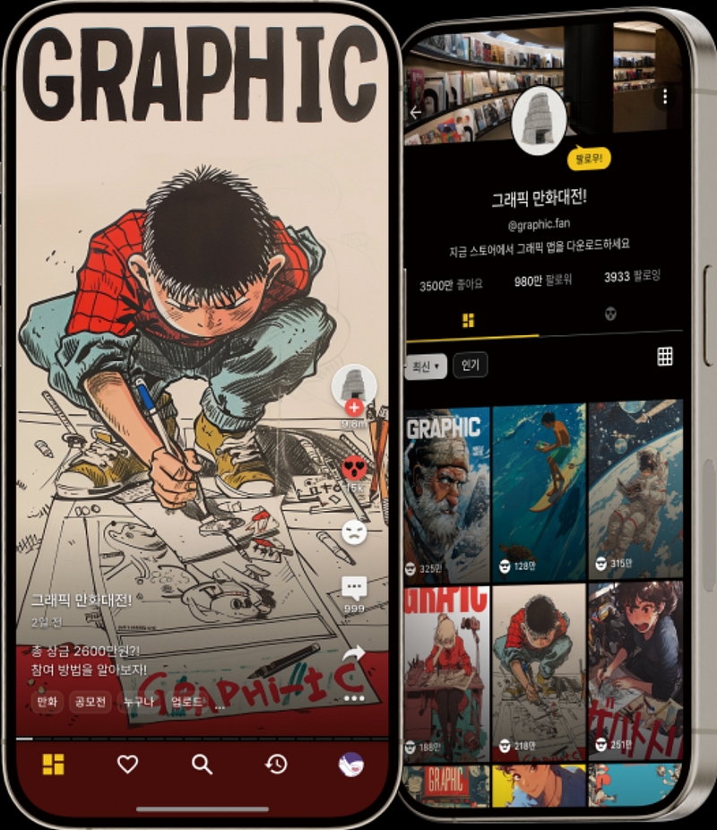그래픽은 이태원에 있는 만화카페 느낌의 오프라인 매장을 갖고 있는 스타트업 회사다. 회사에서 이번에 웹툰과 인스타를 합친, 누구든 만화를 쉽게 공유하고 볼 수 있는 SNS서비스를 시작하였다.