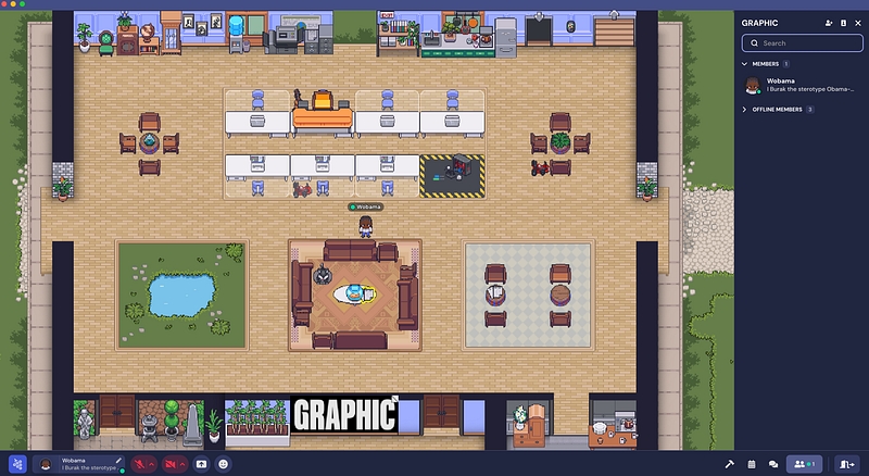 마음이 맞는 사람들이 모인만큼, 만나서 일을하게 되면서 잡담이 많아지는 단점이 생겼는데, 우리는 업무의 효율성을 위해 재택을 하면서 게더타운을 많이 활용했다. 각자의 캐릭터를 고르고 회의시간마다 옹기종기 모여서 회의를 하던게 확실히 잡담하는 빈도가 많이 낮아지기도 했고, 업무에 집중을 할 수 있었던것 같다.
